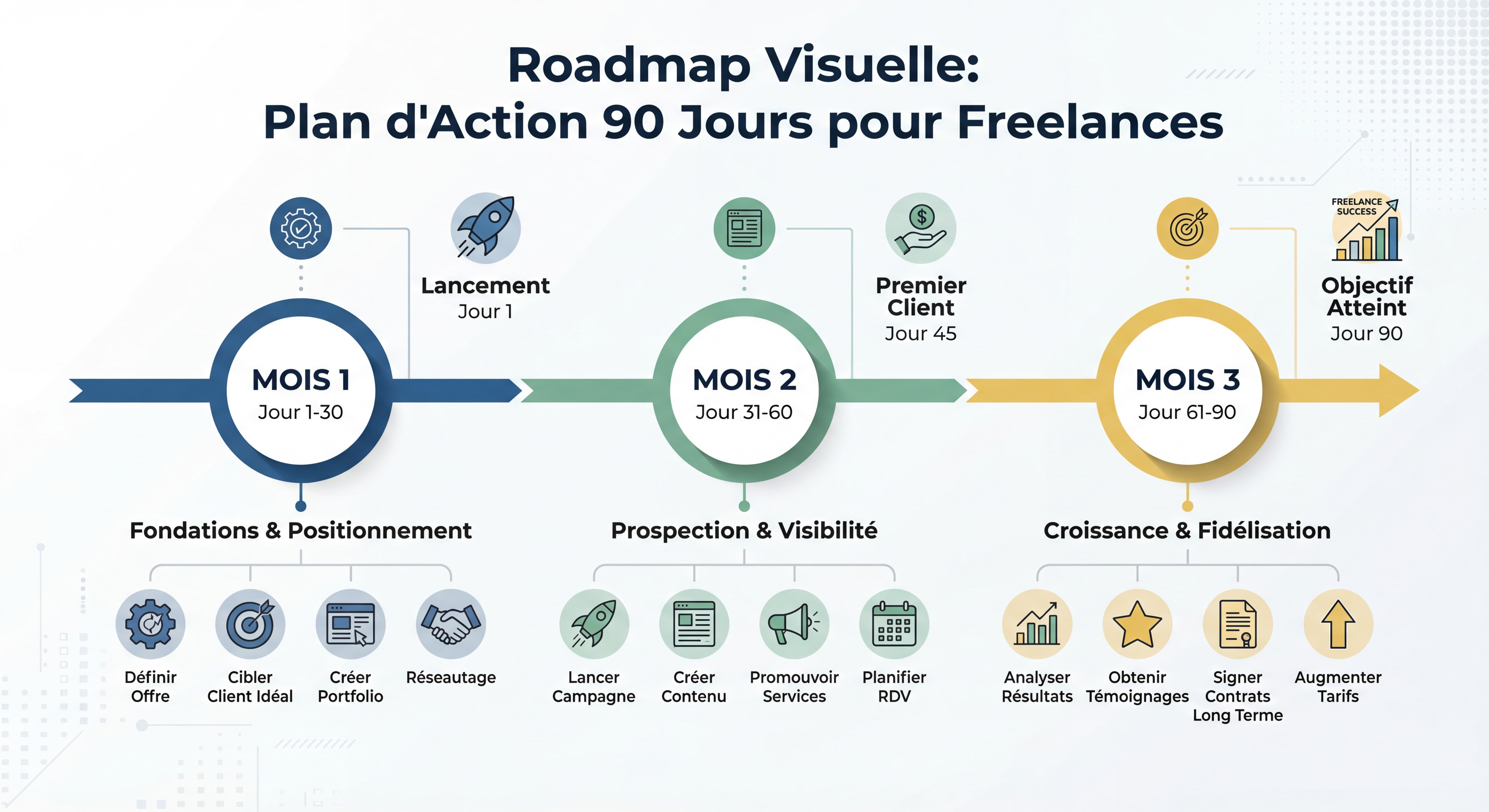 - Mois 2 : Lance 1 nouveau canal acquisition (LinkedIn, Malt, réseau). Contacte 10 prospects qualifiés.