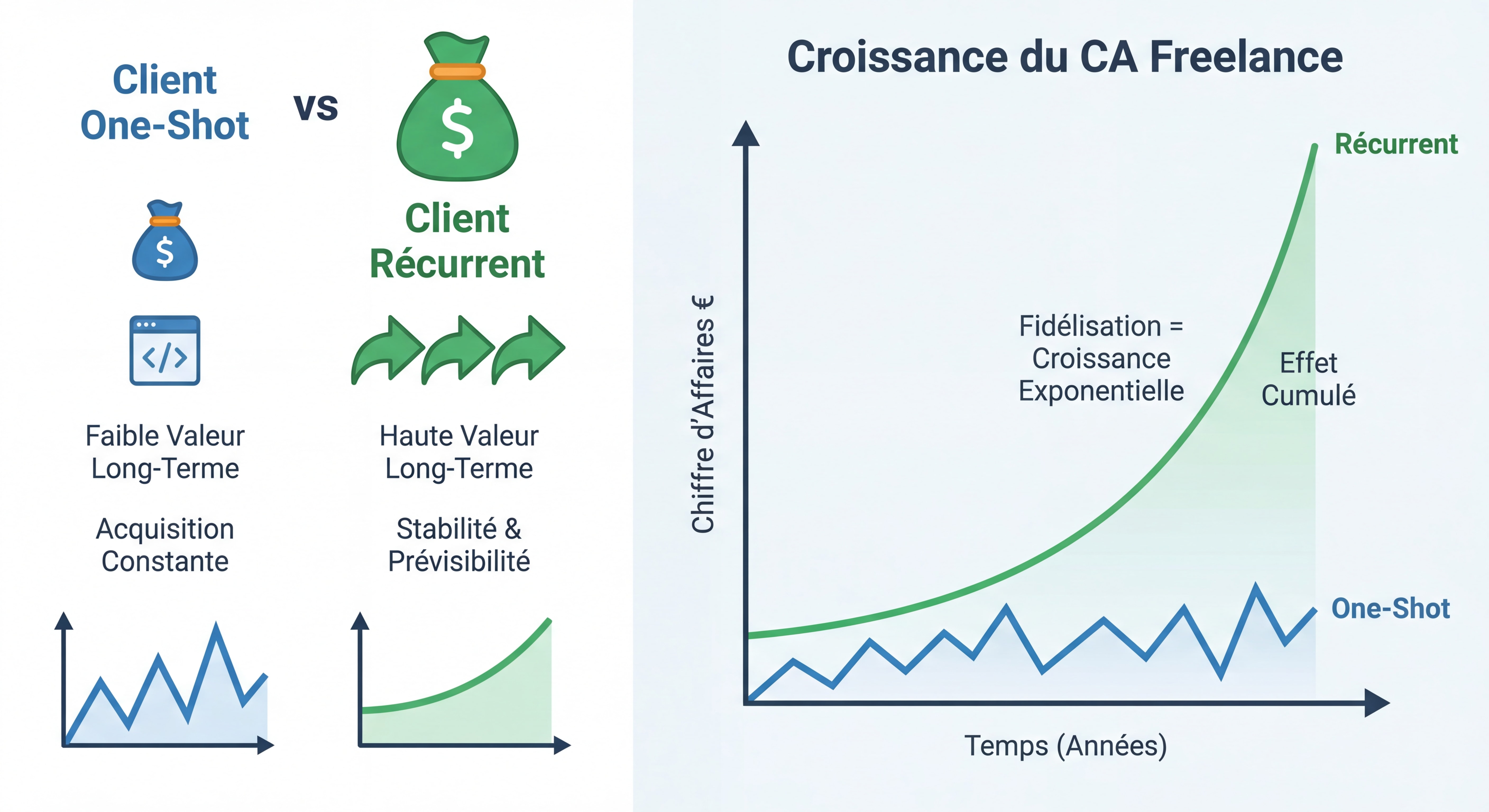 🚀 ×6 : la valeur d'un client récurrent (retainer 6 mois) comparée à un client one-shot — l'erreur de négliger la fidélisation coûte en moyenne 15 000€ par an aux freelances confirmés (Source : calcul basé sur TJM moyen Malt 2026)